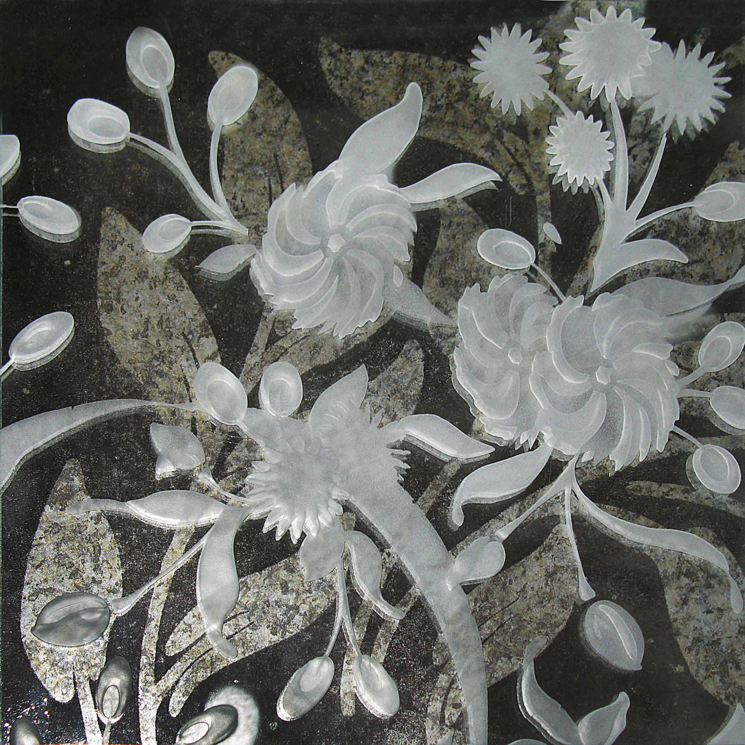 Layers of glass, the top clear layer is carved sandblasted relief glass with a stemed flower design. The bottom layer is eglomise glass with a silver leaf pattern on a mottled background.
