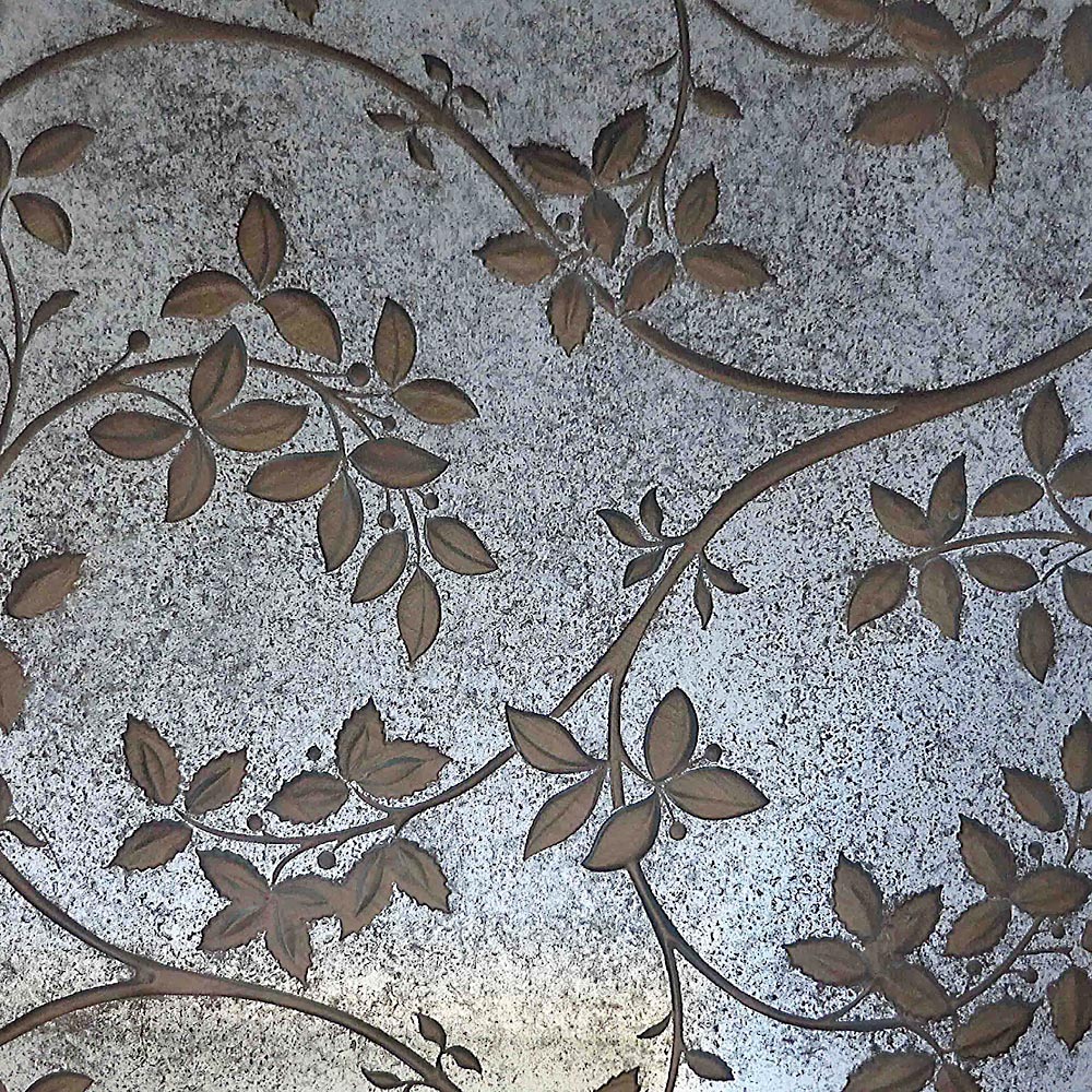 Carved sandblasted relief glass with a stem and leaf design in bronze on an antique mirror background.
