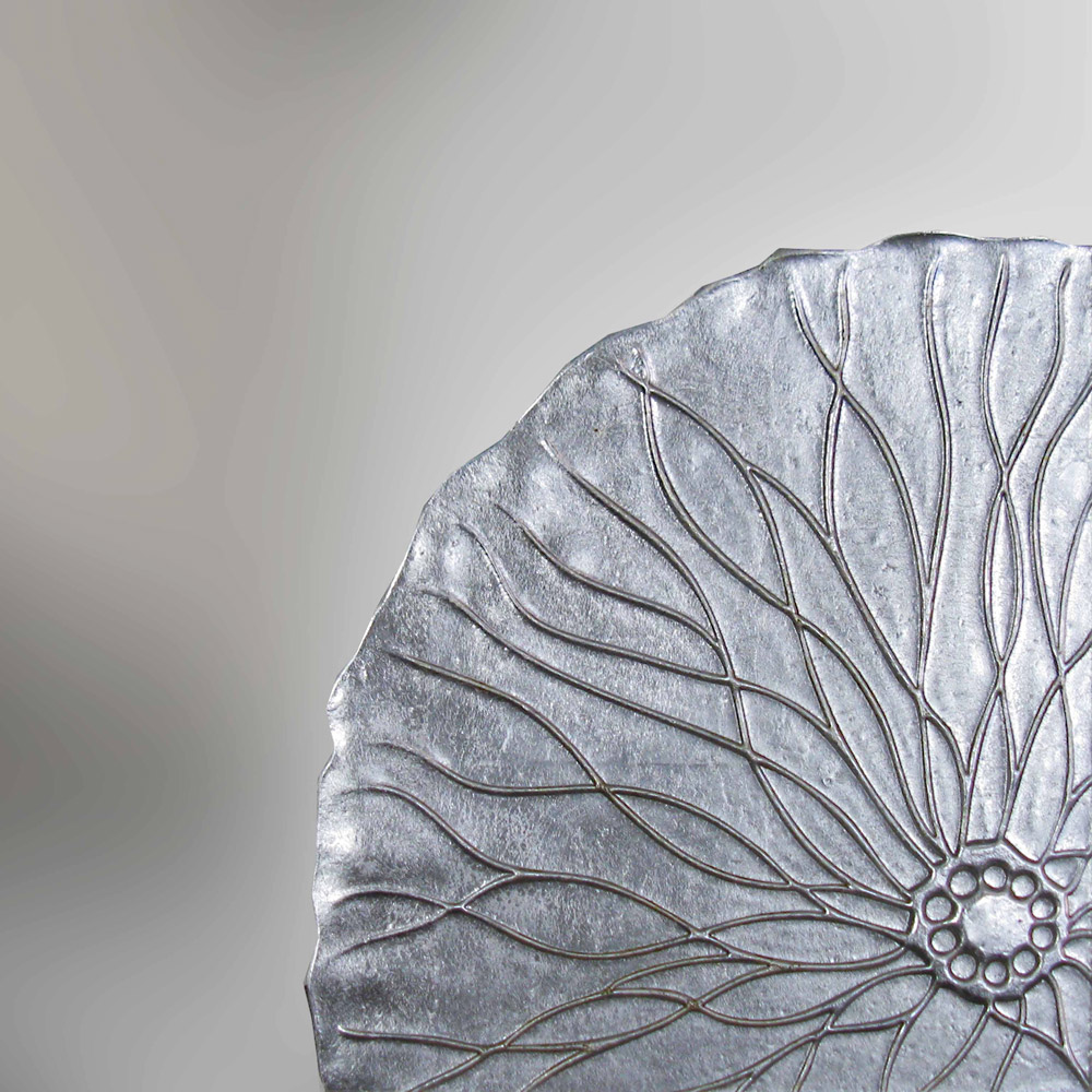 Carved sandblasted relief glass water lilly leaf design on an silver leaf background.