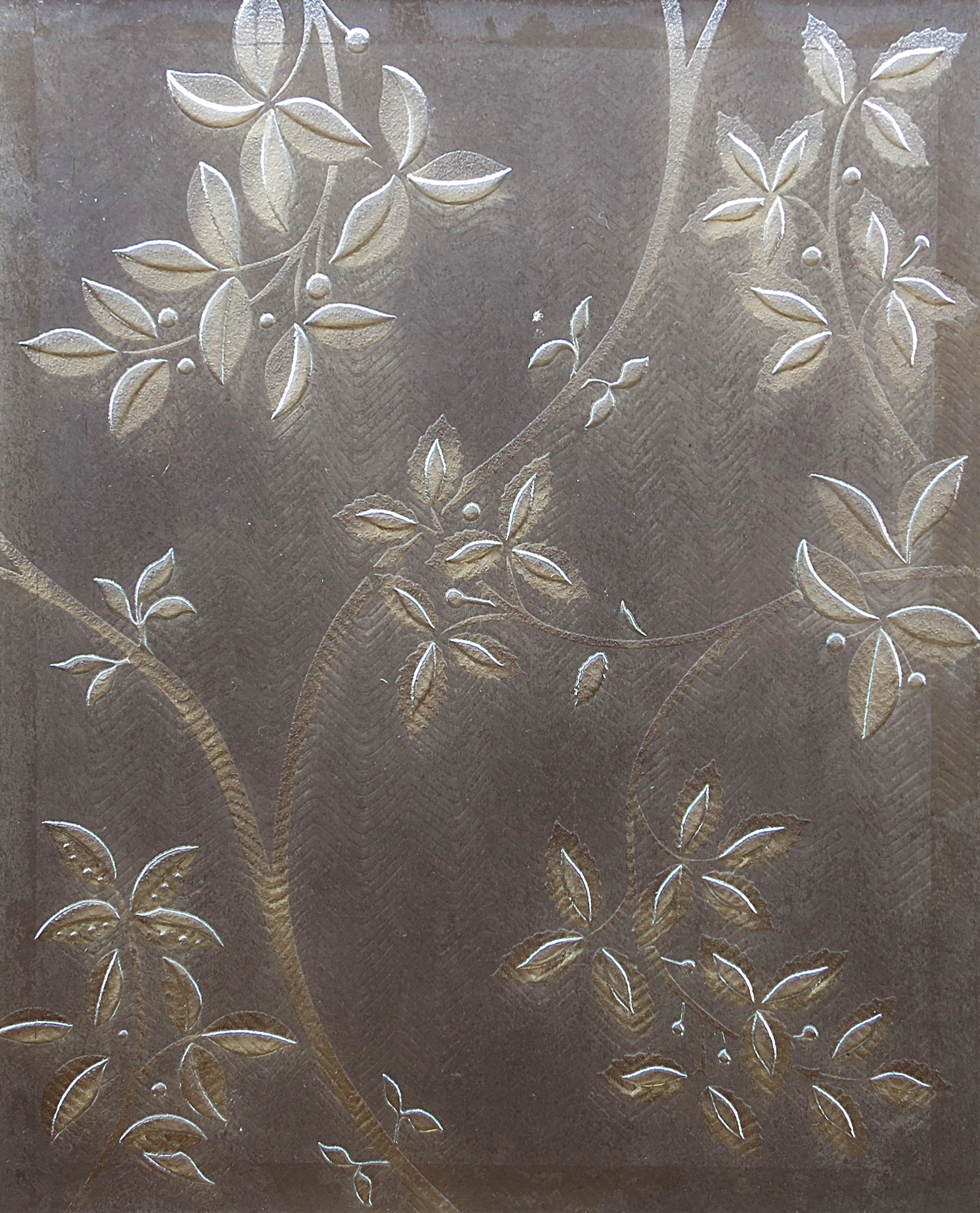 Carved sandblasted relief glass with a stem and leaf design in bronze on an antique mirror chevron background.