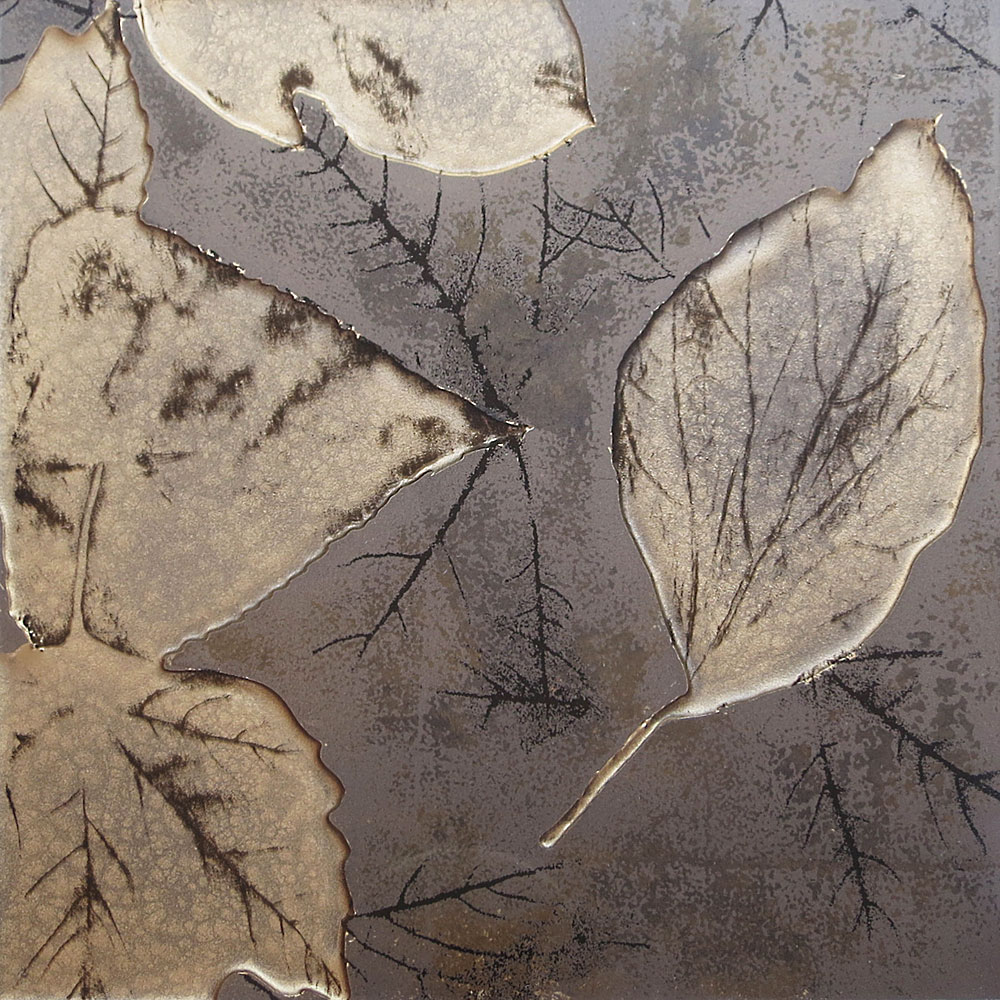 Verre eglomise with carved scattered leaves, backed with falling leaves and finished in textured bronzes and metals.