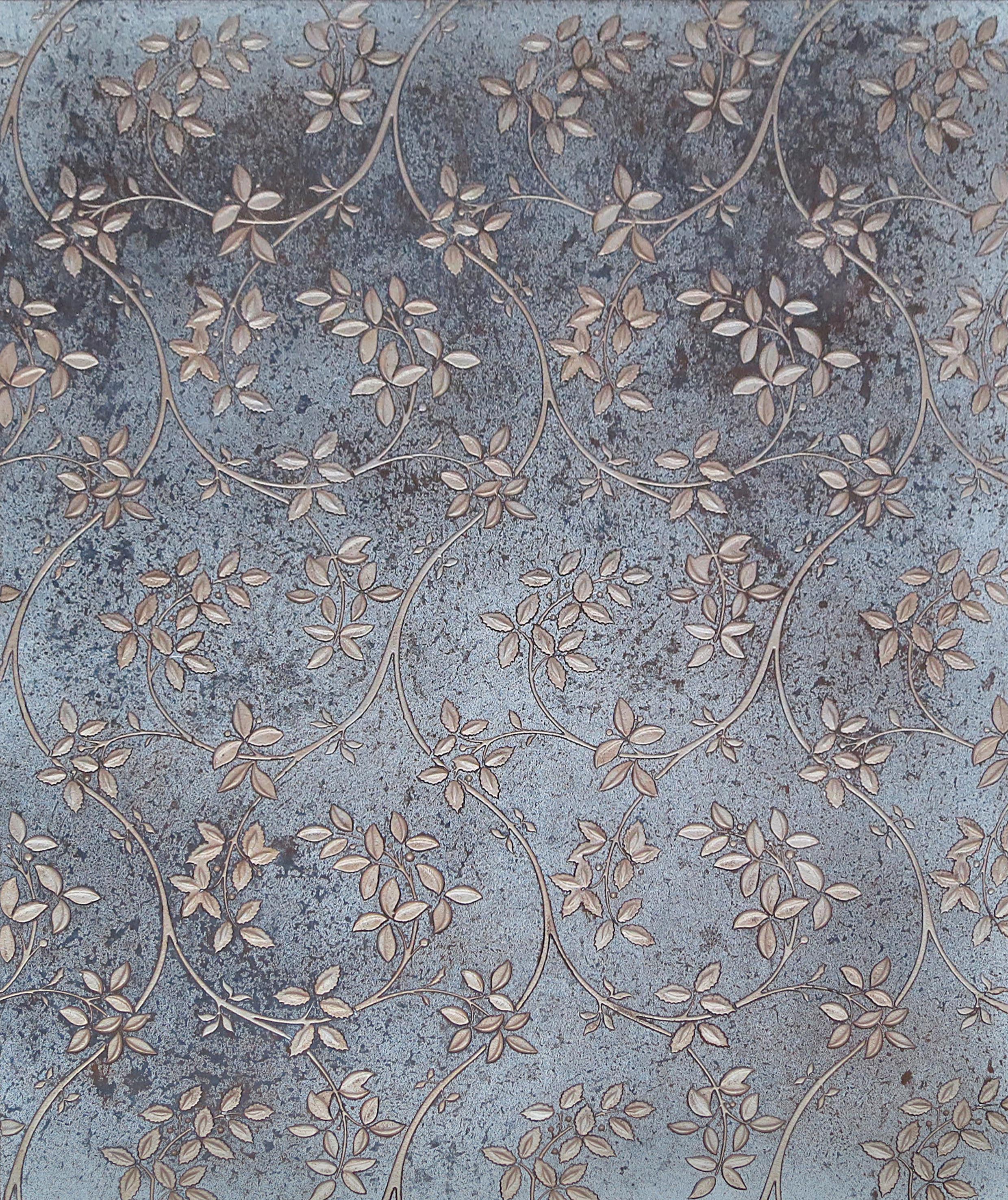 Carved sandblasted relief glass with a stem and leaf design in bronze on an antique mirror background.