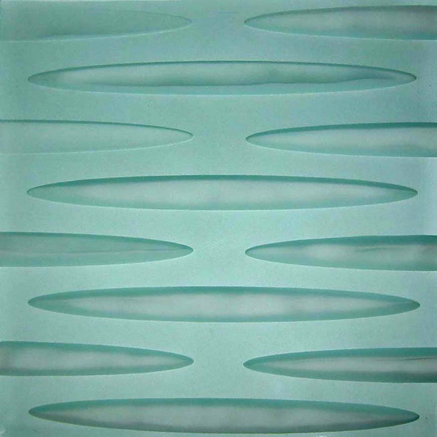 Deeply carved sandblasted relief glass with blue ovals frosted background.