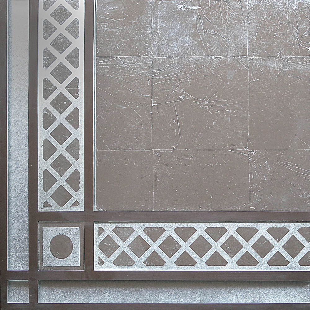 Eglomise glass panel with a trellis pattern border on a silver leaf background.