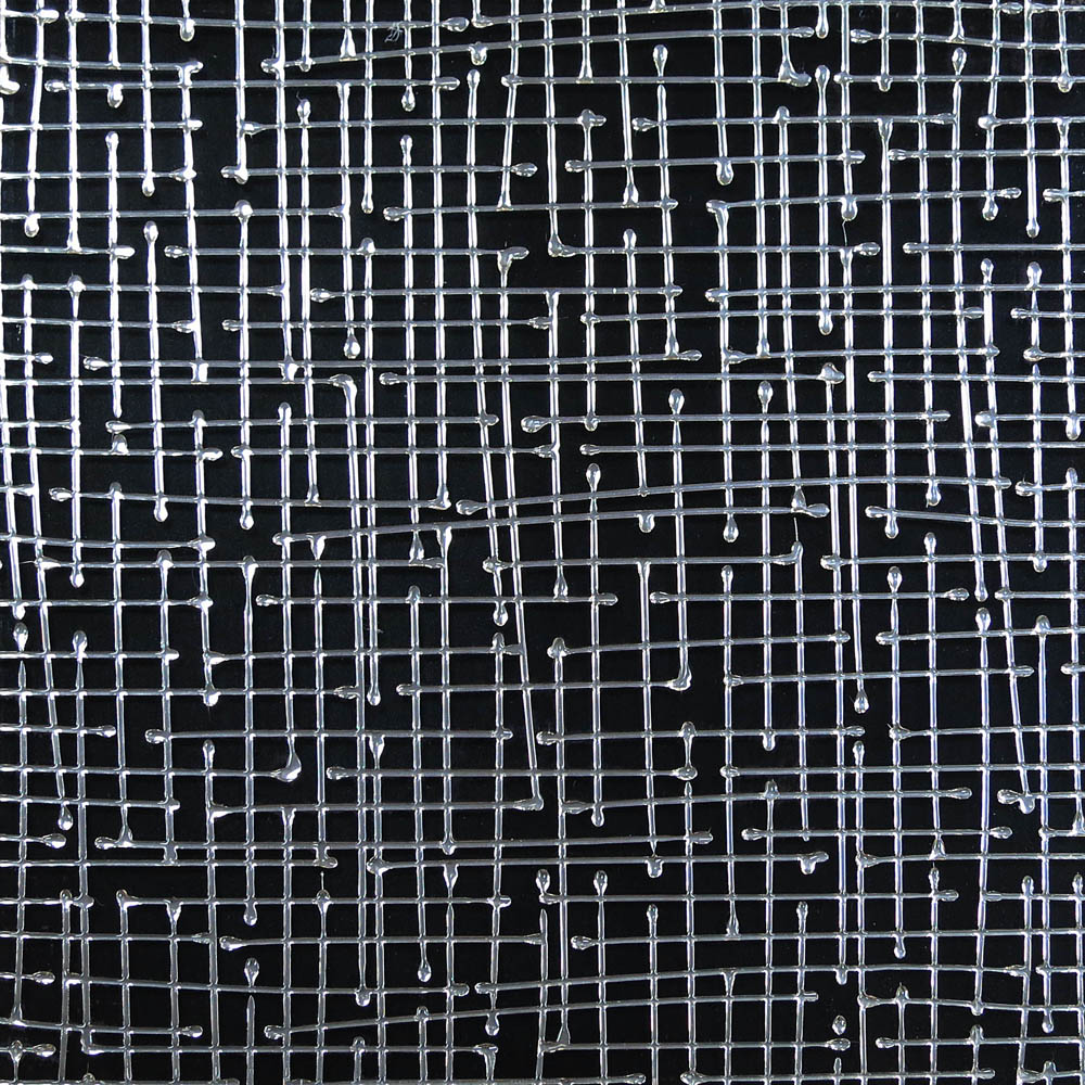 black background with raised silver criss cross pattern of lines ending with a droplet.