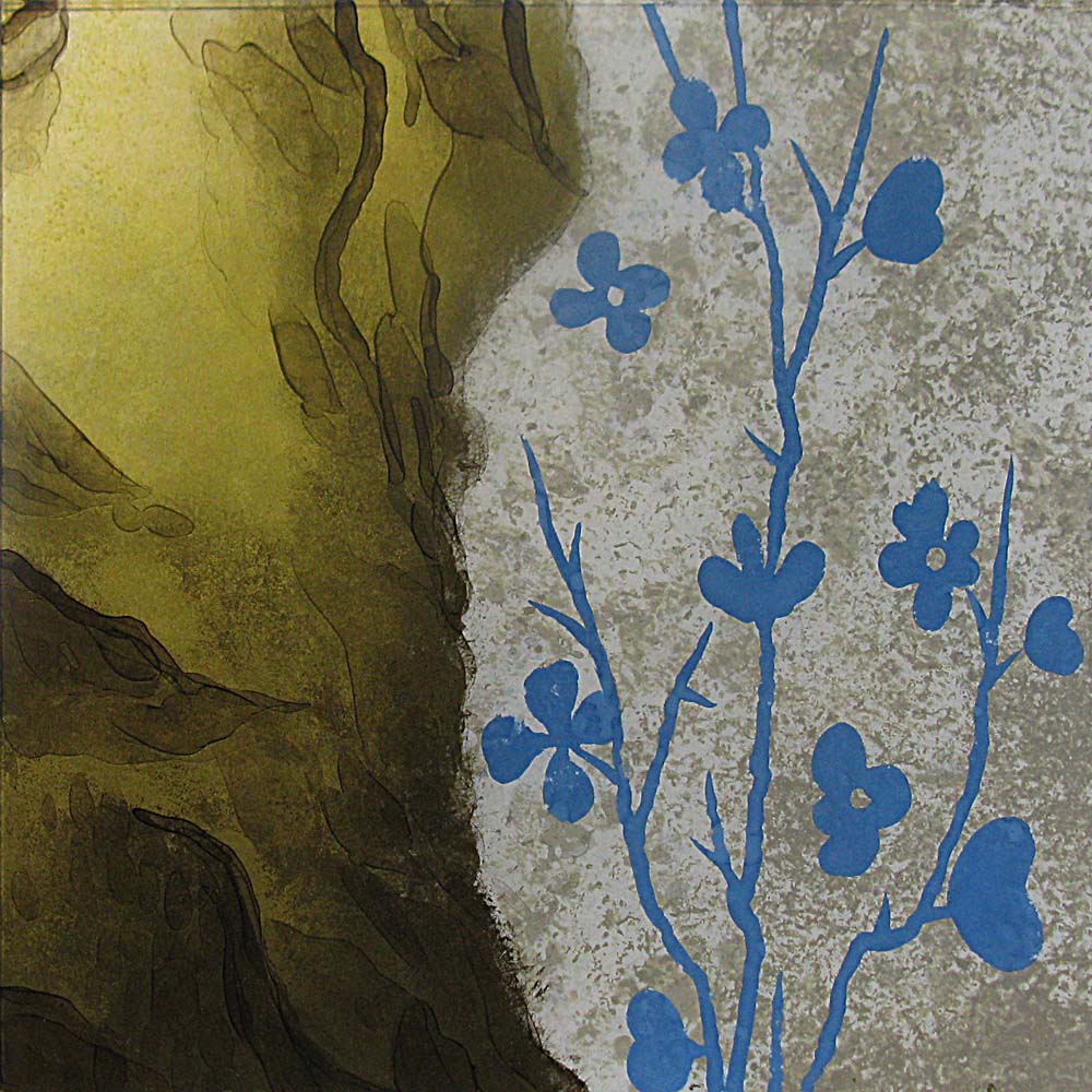 Eglomise glass of a blue tree in a bronze and silver landscape