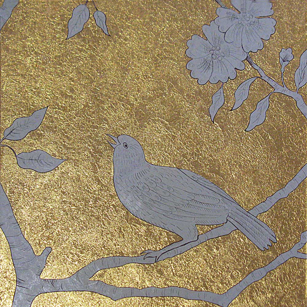 Eglomise glass with silver blossom tree and birds on an a crinkled gold background.