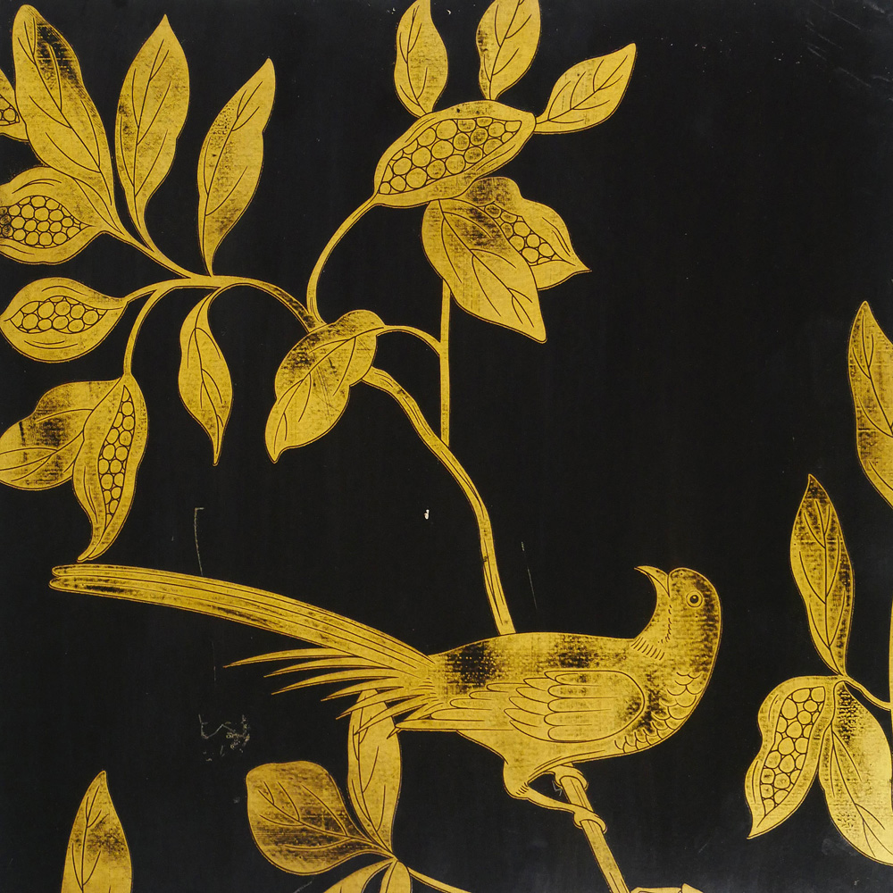 Export lacquer style black and gold chinoiserie design with light antiquing
